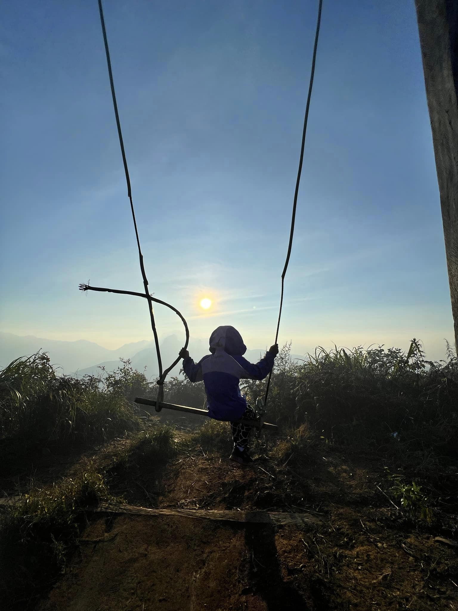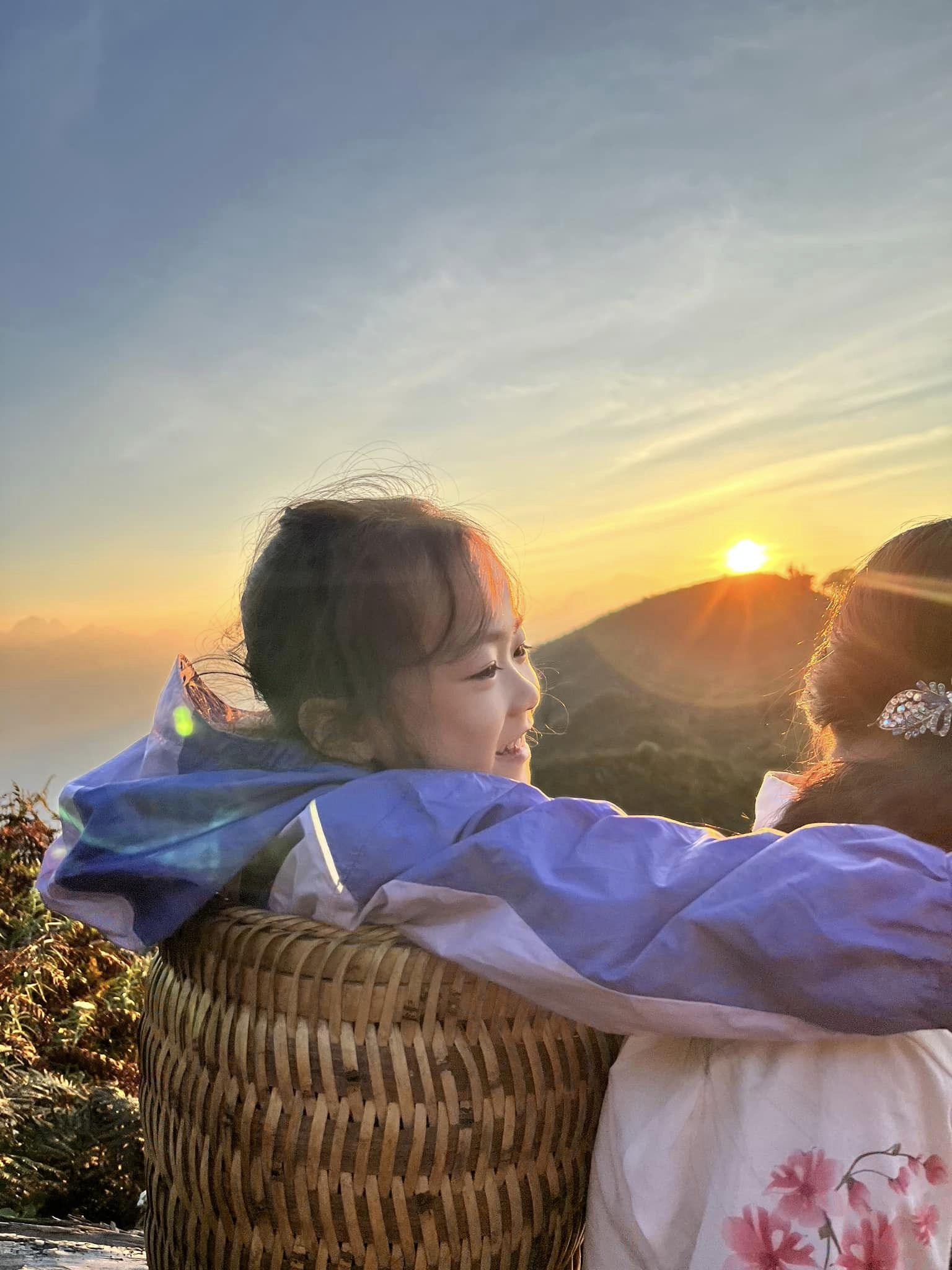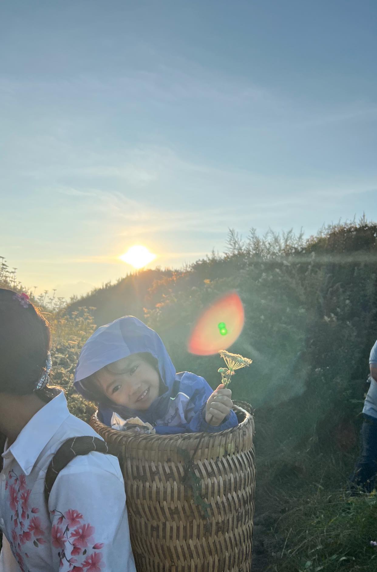 "Với trạng thái leo núi luôn thanh cảnh, vừa đi vừa vãn cảnh của con gái thì mình nói đùa rằng có khi phải sang tháng mới lên được tới đỉnh. Chú tour guide nhanh trí điều phối ngay cô vận chuyển hành lý, đưa em bé Xoài lên chiếc gùi xinh xinh mỗi đoạn dốc cao hay đoạn đường khó đi, vừa được vãn cảnh, vừa được ngủ ngon lành.